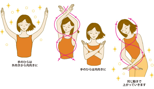 ②身体の前で、手で縦に8の字(無限大∞)を描きながらだんだんと下へ下ろして、ヒザの辺りまで下ろします(前屈みになります)。