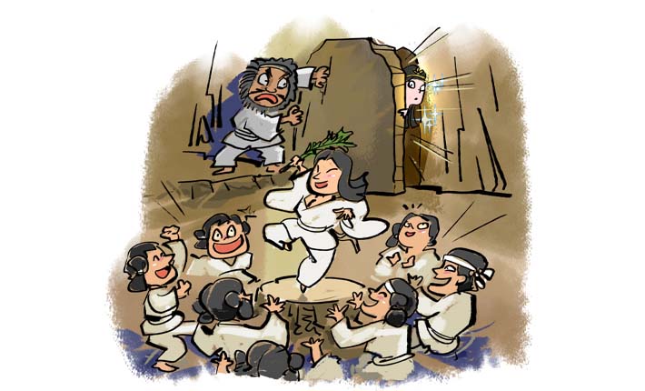 第四話 円でないかい♪ 「円(えん)でないかい、円でないかい♪」 アマテラスオオミカミが天の岩戸にお隠れになり、世の中が真っ暗になってしまった大ピンチのときに、八百万の神々がやったことは、なんと宴でした。 歌って踊って笑って、アマテラスさんも... -