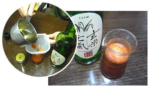 玄米元氣100ccに粉とうがらし大さじ1くらい。一味とうがらしを使用すると辛味が強くなりますので、キムチを漬ける時に使う韓国産とうがらしを使用してください。作ってから3日程おくと旨みが増して美味しくなります。要冷蔵です。