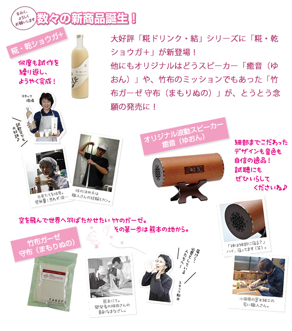 他にもオリジナルはどうスピーカー「癒音(ゆおん)」や、竹布のミッションでもあった「竹布ガーゼ 守布(まもりぬの)」が、とうとう念願の発売に!