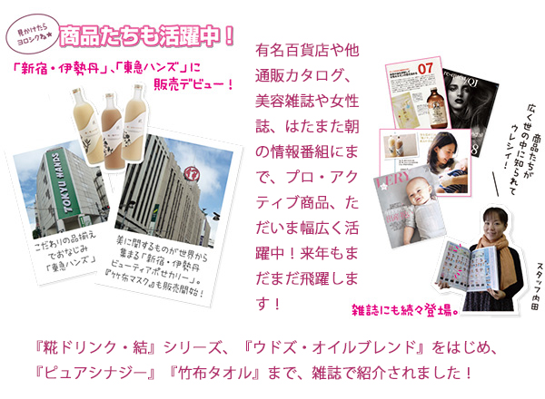 「糀ドリンク・結」シリーズ、「ウドズ・オイルブレンド」をはじめ、「ピュアシナジー」「竹布タオル」まで、雑誌で紹介されました!