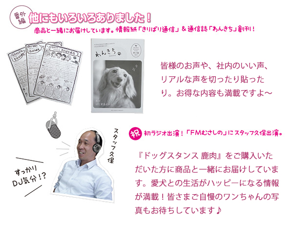 「ドッグスタンス 鹿肉」をご購入いただいた方に商品と一緒にお届けしています。愛犬との生活がハッピーになる情報が満載!皆さまご自慢のワンちゃんの写真もお待ちしています♪