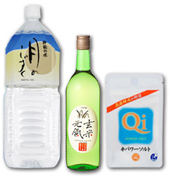 自宅から焼塩「キパワーソルト」、丁寧に発酵させた醤油、味噌、みりん、そして「玄米元氣」。さらに料理の肝心要はお水なので「月のしずく」を持参しました。