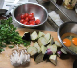 - まずソースから。フライパンにオリーブオイルを熱し、ミニトマト、ナス、しめじを入れざっと炒めたら蓋をして蒸らし焼きにする。