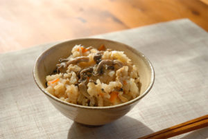 - 蒸らし焼きをしている間に、お皿にごはんを形よく盛り付けておく。
