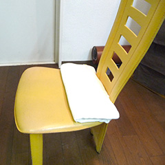 ①バスタオルを6つ折りくらいにして、椅子の後方に敷きます