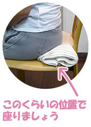外出時にバスタオルを持参することは難しいので、ご家庭や会社で、普段からこの姿勢に慣れておくことが大事です。外では、坐骨を下に、骨盤の上に背骨が乗るんだということを意識して座ってくださいね。